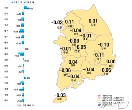 수성구 전셋값 4주 만에 상승 전환시·도별 2월 넷째주 아파트 매매가격지수 변동률(한국부동산원 제공, 재판매 및 DB 금지)관련 키워드대구 아파트 값66주 연속내림세김종엽 기자 강정훈 iM뱅크 행장 첫 경영전략회의서 "속도감 있는 은행" 강조한은 대구경북본부, 중소기업 설 자금 300억 지원