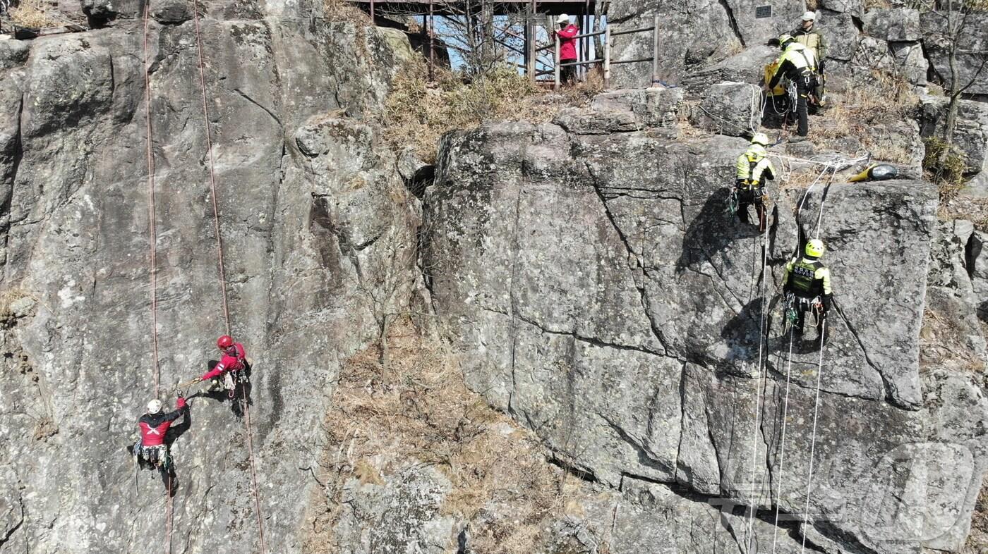 해빙기 새인봉 암장에서 구조훈련하는 무등산 특수산악구조대의 모습. (국립공원공단 무등산국립공원사무소 제공. 재판매 및 DB 금지)/뉴스1 ⓒ News1 이승현 기자