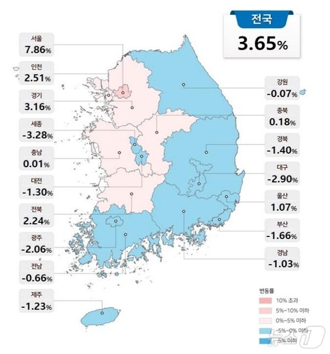 대구 2.9%·경북 1.4%↓시·도별 공동주택 공시가격 변동률.(국토교통부 제공. 재판매 및 DB 금지)관련 키워드대구·경북공동주택공시가격김종엽 기자 강정훈 iM뱅크 행장 첫 경영전략회의서 "속도감 있는 은행" 강조한은 대구경북본부, 중소기업 설 자금 300억 지원관련 기사올해 공동주택 공시가격 3.65% 상승…서울 7.86% '급등'공동주택 공시가 1년 새 3.65%↑…종부세 대상 5.2만가구 증가[2025 공시가격]전국 중위 아파트값 작년보다 300만원 상승…공시가는 3.65%↑[2025 공시가격]전국 공시가 상승률 1위 서울 '7.86%'…하락률 1위 세종 '-3.28%'[2025 공시가격]
