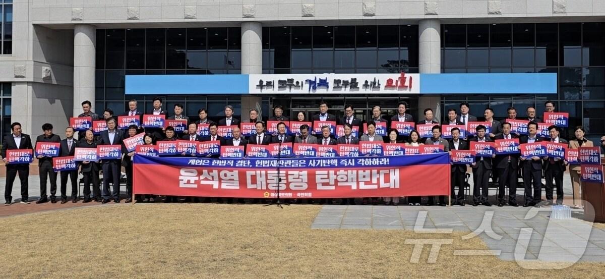 국민의힘 경북도의원 56명이 20일 윤석열 대통령에 대한 탄핵 각하를 촉구했다.(국민의힘 경북도당 제공. 재판매 및 DB 금지)2025.3.20/뉴스1관련 키워드경상북도경북도의회윤석열탄핵반대계엄신성훈 기자 '2조 피해' 의성 산불 실화자 집행유예…산림당국 손배 청구할까26명 숨졌는데…'경북 대형 산불' 낸 성묘객·농민 1심 집유, 왜?(종합)