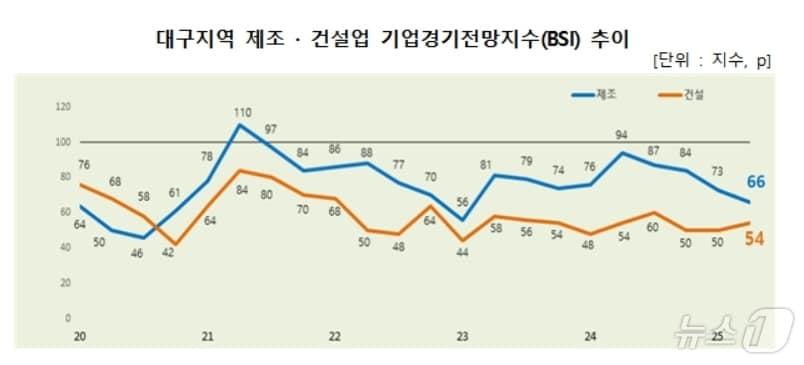"정부 정책적 지원·기업 자구노력 필요"대구지역 제조·건설업 기업경기전망지수(BSI) 추이(대구상의 제공. 재판매 및 DB 금지)관련 키워드대구 제조업4분기 연속 둔화건설업 상승김종엽 기자 강정훈 iM뱅크 행장 첫 경영전략회의서 "속도감 있는 은행" 강조한은 대구경북본부, 중소기업 설 자금 300억 지원관련 기사대구 제조업 경기전망 6분기 연속 둔화…건설업 2분기 만에 하락'대구 -3.9%·인천 -1.4%' 역성장…'건설·제조' 내수 부진 직격탄