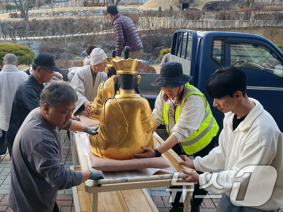 보물 제246호 석조여래좌상은 방염포로 감싸 이동 대기중지난 22일 경북 의성군 안평면 운람사에서 스님과 신도들이 산불이 확산되자 아미타삼존불, 탄생불, 신중탱화 등 문화재급 성보를 조문국박물관으로 옮기고 있다. (고운사 제공, 재판매 및 DB 금지) 2025.3.23/뉴스1 ⓒ News1 신성훈 기자관련 키워드의성산불고운사승려고운사산림청정우용 기자 성주군, 중소기업에 설 운전자금 225억 지원청도군의회 "군수 욕설·모욕적 표현으로 군민 신뢰 훼손"관련 기사[뉴스1 PICK]화마가 휩쓸고 간 천년고찰 고운사… '연수전·가운루' 전소의성 산불, 인근 지자체로 전방위 확산…화염 휩싸인 경북 북부 (종합)천년고찰 고운사 잿더미…세계유산 '안동 봉정사' 유물 긴급 이송 조치'의성 산불' 천년고찰 고운사 삼켜…보물 석조여래좌상은 무사(종합)