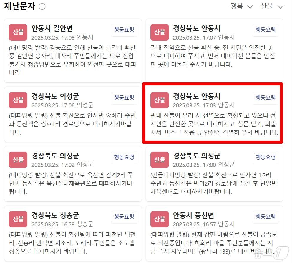 관련 키워드안동시산불재난문자최창호 기자 5급 인사 발표→대기발령→다시 임명장…포항시 무슨 일'경주 관광 1번지' 황리단길 주차 숨통…894면 대형 주차장 준공관련 기사의성 주민 대피령…비봉리 야산 산불 대응 2단계(종합)대형 산불마다 '지휘 일원화' 지적…"대응체계 개편 필요"시도때도 없는 재난문자 고령층엔 '노답'…"문자 온줄 모르고 대피 못해"괴물 산불로 기지국 화재…통신 인프라 복구 총력[뉴스잇(IT)쥬]경북 산불, '마을순찰대'가 많은 인명 구했다…의성군은 사망 1명