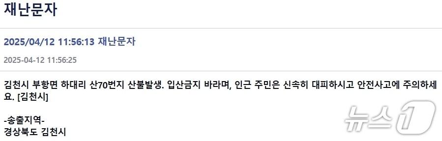 김천시 재난문자/뉴스1관련 키워드김천산불김천 부항면 산불산불김천시 안전재난문자정우용 기자 칠곡군 '희망 2026 나눔캠페인' 목표액 4억5000만원 조기 달성경찰, 서산영덕고속도로 다중 추돌 사고 수사 착수관련 기사경북 김천서 산불 발생…1시간 만에 진화김천 부항면 하대리 산불 1시간만에 진화(종합)