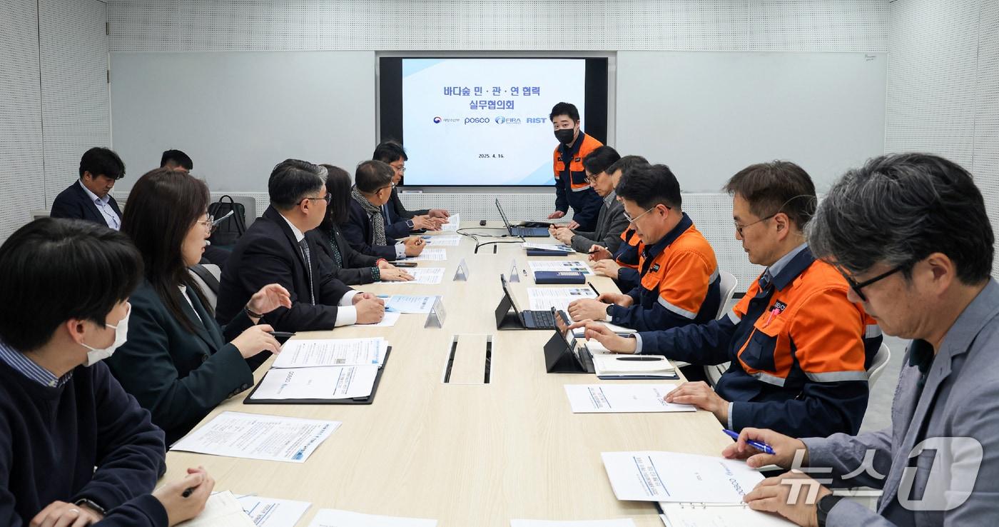 16일 포스코 포항본사에서 열린 바다 생태계 복원 민관연협력 실무회의에서 기관 관계자들이 의견을 나누고 있다. (포스코 포항제철소제공, 제판메 및 DB 금지) 2025.4.16/뉴스1