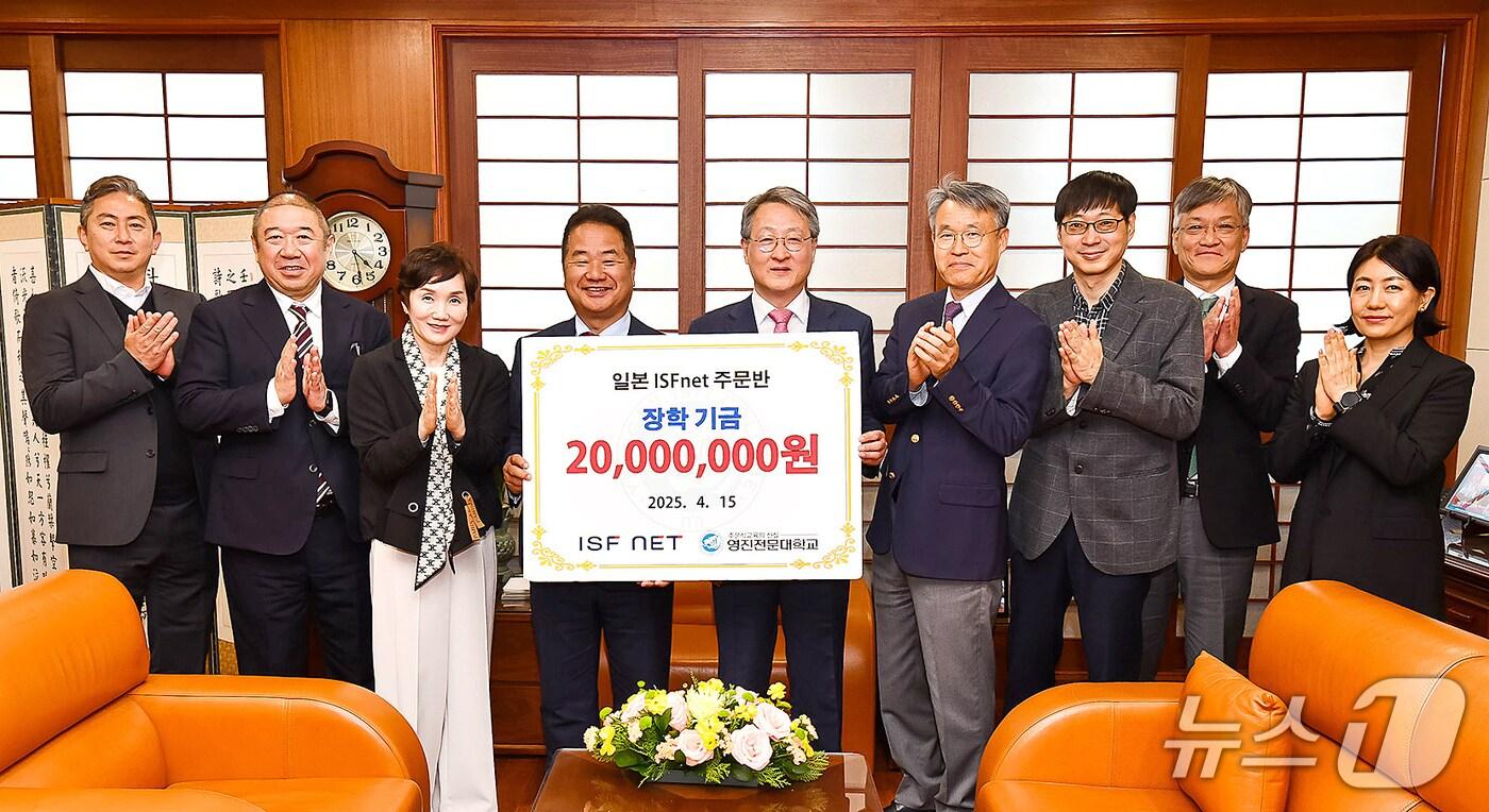 일본 ISFNET 와타나베 유키요시 회장(왼쪽 네번째)과 최재영 영진전문대 총장(왼쪽 다섯째) 등 관계자들이 장학금 기탁식에서 기념 촬영을 하고 있다. (영진전문대 제공)