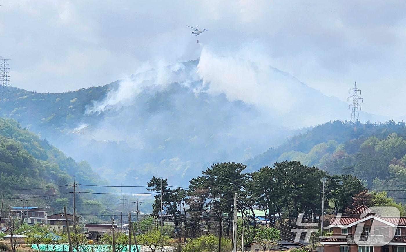 17일 오후 1시17분쯤 경북 경주시 천북면 오야리 산에서 원인을 알 수 없는 불이 나자 핼기가 투입돼 진화 작업을 벌이고 있다. (독자제공) 2025.4.17/뉴스1 ⓒ News1 최창호 기자