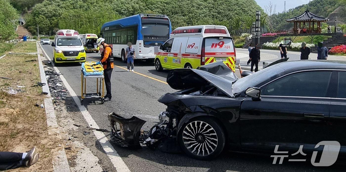 19일 오전 11시 15분쯤 경북 경주시 유금리 형산강역사 문화공원 7번 국도에서 포항방향으로 달리던 시내버스와 그랜저 승용차가 정면 충돌했다. (경북소방본부제공, 제판매 및 DB 금지) 2025.4.20/뉴스1
