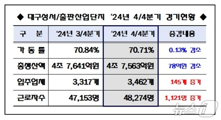 입주업체·근로자 수는 증가대구성서산업단지 지난해 4분기 경기 현황.(대구성서산단관리공단 제공. 재판매 및 DB 금지)관련 키워드대구성서산단가동률4분기만에 둔화김종엽 기자 섬유개발연구원-의류산업학회, '생성형 AI 서비스 고도화' 협약iM에셋자산운용, 사모펀드 '히어로셀렉션' 출시관련 기사대구 성서산단 가동률·생산액 2분기 연속 상승…근로자 수는 감소