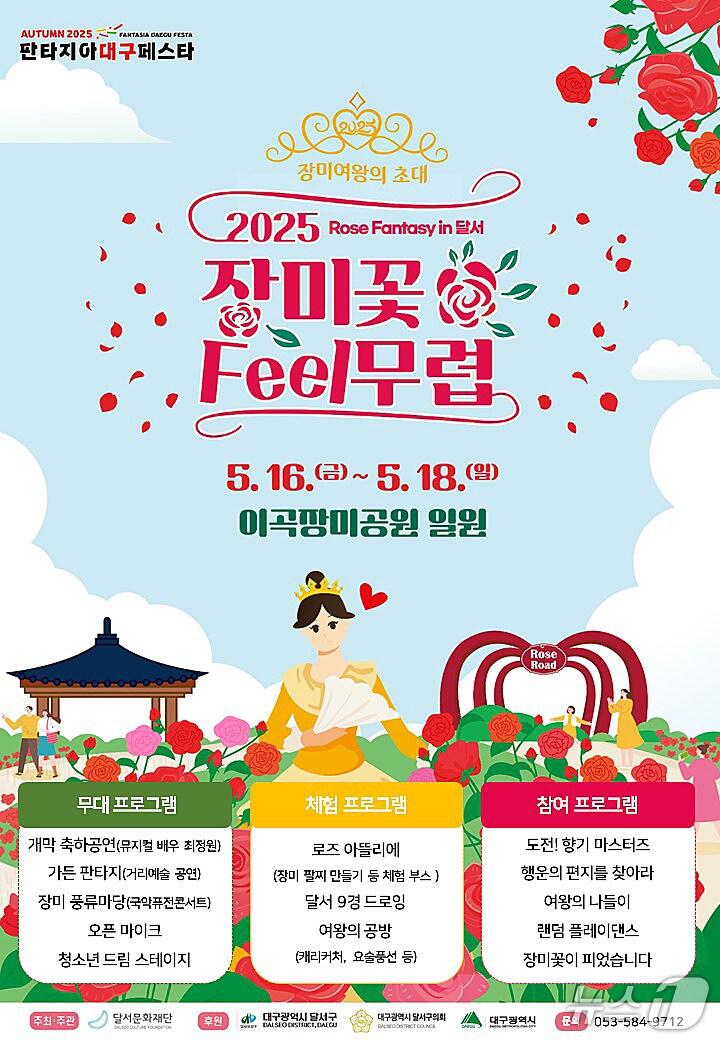 16~18일 대구 달서구 이곡장미공원에서 열리는 '2025 장미꽃 필(Feel) 무렵' 홍보 포스터. (달서구 제공)관련 키워드달서구이곡장미공원공정식 기자 [뉴스1 PICK]세밑 한파 기승…'병오년 새해도 강추위 이어져'영진전문대 보건의료행정과, 국가고시 합격률 81.8% 기록관련 기사'대구데이 페스티벌' 20~21일 수성못 상화동산서[뉴스1 PICK]'계절의 여왕' 5월 전국 곳곳이 花한 장미 물결[오늘의 날씨] 대구·경북(16일,금)…늦은 오후부터 비, 낮 22~26도[오늘의 날씨]대구·경북(15일,목)…오후까지 빗방울, 낮 21~27도