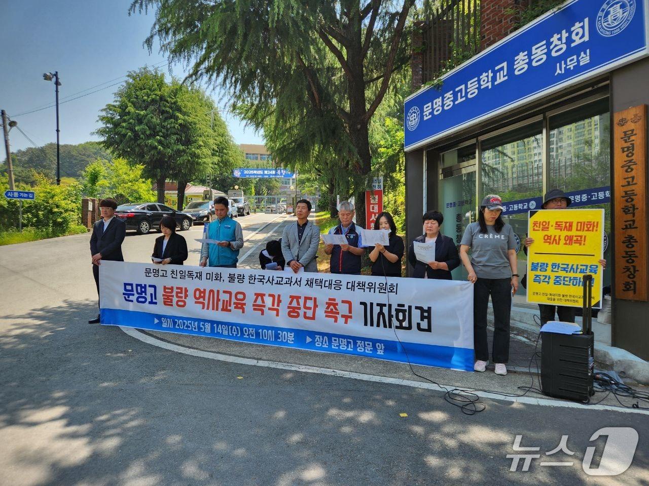 교장 상대한 '교과서 선정 처분 효력 정지 가처분' 기각문명고 불량 한국사교과서 채택 대응 대책위원회 소속 학부모들이 14일 경북 경산시 문명고 앞에서 '불량 역사교육' 즉각 중단을 촉구했다.(문명고 불량 한국사교과서 채택 대응 대책위원회 제공. 재판매 및 DB 금지)관련 키워드문명고친일독재미화이성덕 기자 "내년엔 행복하길" 일몰 명소 시민 북적…강릉은 해돋이 준비(종합)대구 앞산 해넘이전망대 찾은 시민들 "내년에도 무탈하길"관련 기사교육부, '친일·독재' 논란 한국사 교과서 검정 취소 착수감사원 "교육부, 역사교과서 표지갈이 한 한국학력평가원 조치해야""검인정 취소될 수도" 역사교과서 논란 경산 문명고에 시민단체 소송
