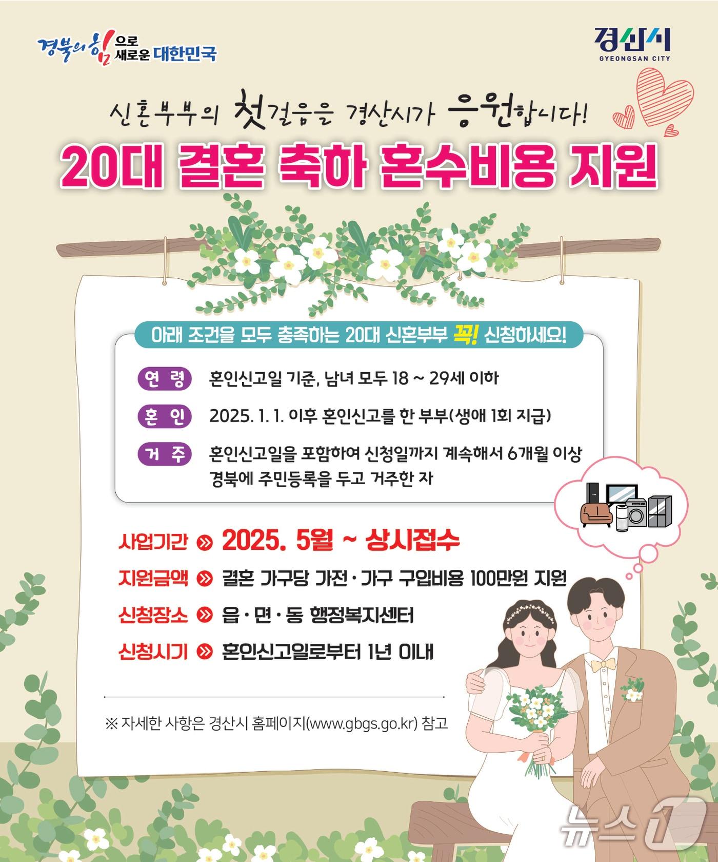 경산시 20대 신혼부부에 가전·가구 구입비 지원 /뉴스1관련 키워드경산. 경산시20대신혼부부혼수비용조현일경산시장정우용 기자 구미시, 아시아 최대 AI 데이터센터 '원스톱지원단' 가동새해 첫날 대구·경북 고속도로 해맞이 차량 '최대 54만대' 예상