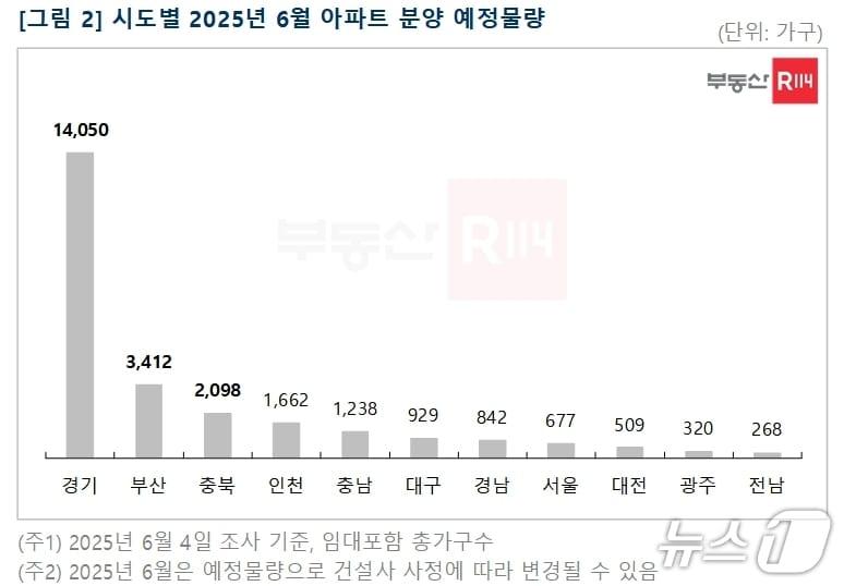 시·도별 6월 아파트 분양 예정 물량(부동산 R114 제공. 재판매 및 DB 금지)관련 키워드대구아파트분양김종엽 기자 iM뱅크 차기 은행장 최종 후보 강정훈 부행장 선정[속보] iM뱅크 차기 은행장 최종 후보에 강정훈 부행장관련 기사"광주 군공항 부지에 디즈니랜드 유치해야"대구 아파트 입주전망지수 60선 '뚝'…주담대출 중단 영향대출규제에 입주 전망 냉각…12월 지수 75.5로 두 달째 하락지방 분양시장 양극화…입지 따라 '완판'·'미달' 갈렸다대구 아파트 분양 전망지수 '80선 붕괴'…2개월째 둔화
