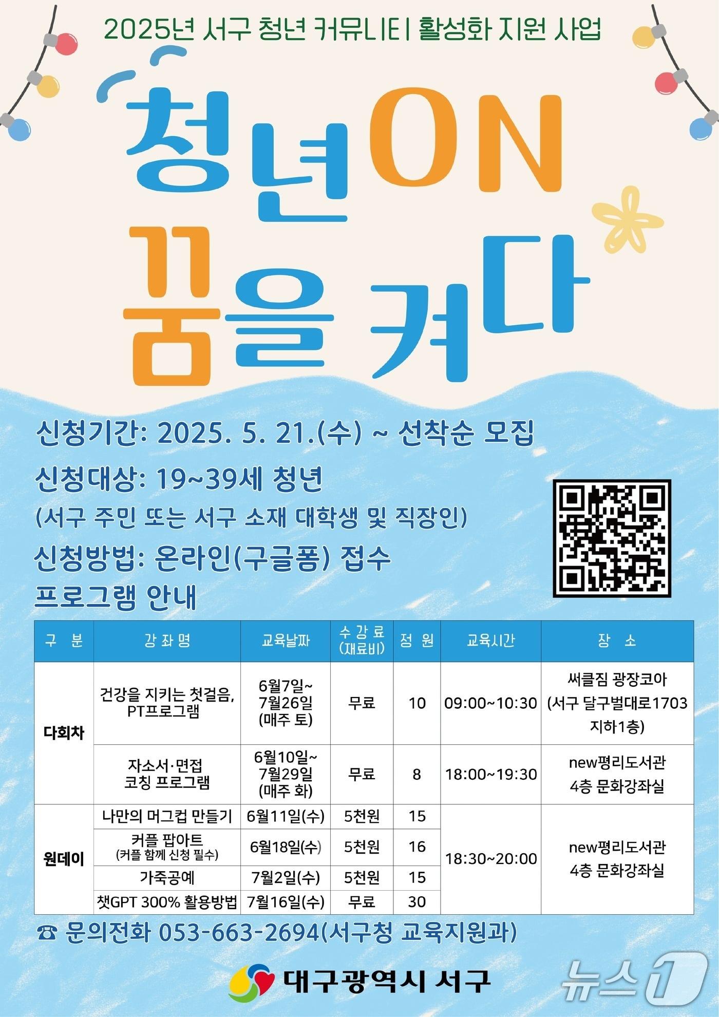 대구 서구 청년 커뮤니티 활성화 지원 사업 홍보 포스터(대구 서구 제공.재판매 및 DB 금지)관련 키워드대구서구청년활동지원이성덕 기자 [오늘의 날씨]대구·경북(20일, 토)…곳곳 비, 낮 최고 10~19도이진욱 대구 동구의원 "대구 빈집 31% 동구에…생활 정책 전환 필요"관련 기사"광주 군공항 부지에 디즈니랜드 유치해야"대구 서구 '청년센터 청년마당' 20일 개소대구 서구, 청년정책위원회 위원 6명 21일까지 모집[오늘의 주요일정] 정치·정부 (18일, 목)개관 3년 앞둔 대구 비원뮤직홀 '클래식 성지' 부상…공연 매진 행진