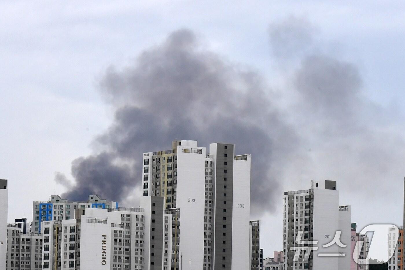 13일 오후 3시30분쯤 포항시 북구 흥해읍 이인리 산 정상 부근의 농막에서 불이 나 검은 연기가 도심으로 번지고 있다. ⓒ News1 최창호 기자