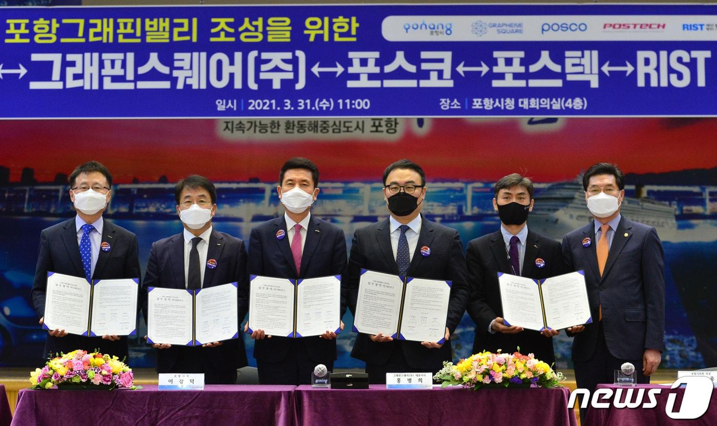 이강덕 경북 포항시장(왼쪽 세번째)이 31일 포항 시청 대회의실에서 홍병희 그래핀스퀘어(주) 대표 이사(오른쪽 세번째)등과 함께 '그래핀' 산업 육성을 위한 업무협약을 체결하고 있다. 이날 포항시는 포스코, 포스텍, 포항산업과학연구원(RIST)과 함께 꿈의 소재로 불리는 '그래핀' 산업 육성을 위한 업무협약을 체결했다. 이번 협약을 통해 그래핀스퀘어(주)는 RIST에 그래핀 생산라인 구축, 시제품 생산·테스트 후 내년 초부터 양산을 시작할 예정이다. 2021.3.31/뉴스1 ⓒ News1 최창호 기자