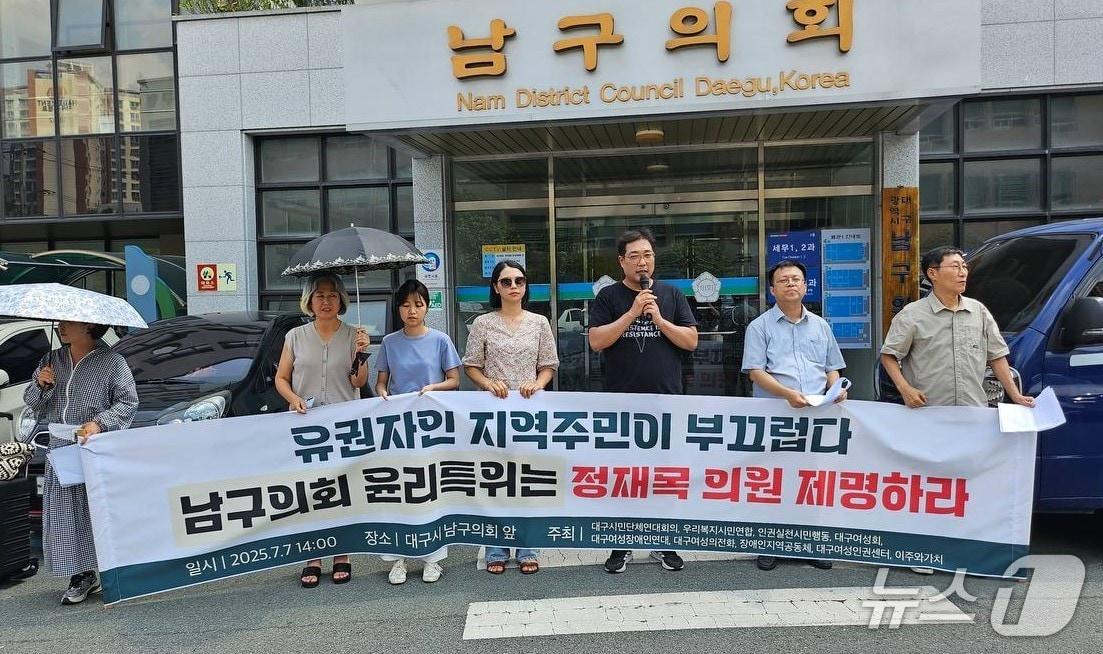 남구의회 윤리심사자문위 이어 윤리특위도 '제명' 의결대구시민단체연대회의 등 9개 단체가 7일 대구 남구의회 앞에서 기자회견을 열고 음주운전 방조 혐의로 기소된 정재목 남구의원 제명을 촉구하고 있다. (대구시민단체연대회의 제공. 재판매 및 DB 금지) 2025.7.7/뉴스1관련 키워드대구 남구의회남구의원음주운전 방조대구 기초의원정재목 구의원대구시민단체연대회의남승렬 기자 경북대 이지훈 교수, 전고체전지 성능·수명 좌우 요인 규명대구시, 'AI로봇 글로벌 혁신특구' 사업 추진…10개 기업 참여관련 기사음주운전 방조 대구 남구의원, 제명 집행정지 소송 '기각'무면허 울산시의원에 '경고'로 끝…'제 식구 감싸기' 논란 지속 (종합)'음주운전 방조' 대구 남구의원 제명…의원 전원 찬성대구 남구의회 윤리심사자문위, 음주운전 방조 구의원 제명 권고음주운전 방조 혐의 정재목 대구 남구의회 부의장 불신임안 부결