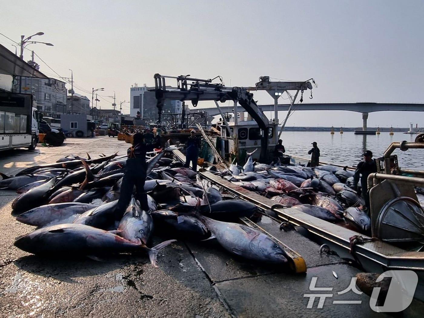 쿼터량 때문에 대부분 가축 사료로 처분 계획8일 경북 영덕군 강구항에서 어민들이 강구 앞 바다에서 잡힌 대형 참치들을 위판하기 위해 준비하고 있다. 참치들은 연안에서 약 20km 떨어진 곳에 쳐 둔 정치망 그물에 잡혔다. 2025.7.8/뉴스1 ⓒ News1 최창호 기자8일 경북 영덕군 강구항에서 어민들이 강구 앞 바다에서 잡힌 대형 참치들을 위판하기 위해 준비하고 있다.. 2025.7.8/뉴스1 ⓒ News1 최창호 기자8일 경북 영덕군 강구항에서 어민들이 강구 앞 바다에서 잡힌 대형 참치들을 위판하기 위해 준비하고 있다. 2025.7.8/뉴스1 ⓒ News1 최창호 기자관련 키워드영덕군참치 대형참치정치망 그물최창호 기자 경주소방서, 경북 소방관서 긴급구조훈련 평가 1위경주 사립대 교수, 여학생 성추행 혐의로 불구속 송치관련 기사포항·영덕에 동해안 첫 참치 전용 급랭시설 짓는다영덕서 대형 참치 70여마리 '대박'…어민들 "많이 잡혀도 걱정" 왜?영덕서 300kg 넘는 초대형 참다랑어 혼획…1050만원에 위판