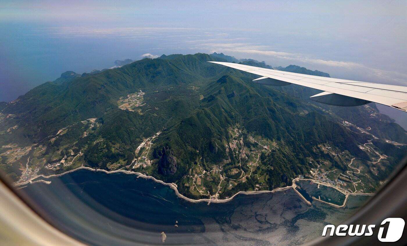 포항경주공항에서 이륙한 엠브레어 제트 여객기가 울릉도 상공을 선회하고 있다. 2023.5.15/뉴스1 ⓒ News1 최창호 기자