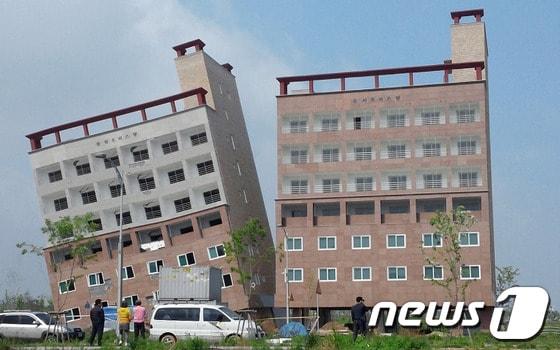 아산 테크노벨리내 신축 오피스텔 30도 기울어 붕괴위험12일 오전 충남 아산시 둔포면 석곡리 아산테크노밸리 내에 신축중인 오피스텔 건물이 기울어져 붕괴 위기에 처했다. 충남소방본부에 따르면 6층 높이의 이 건물은 현재 20도 가량 기울어져 있다는 상태다.2014.5.12/뉴스1 © News1 한기원 기자