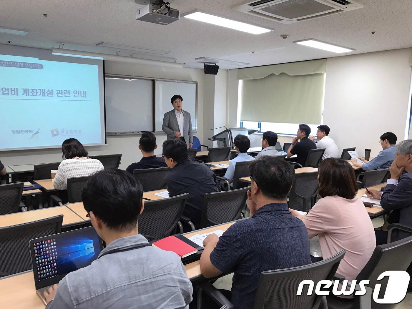 한밭대학교 창업지원단이 지난 11일 협약 전 사업설명회를 개최한 가운데 송우용 단장(사진 속 중앙)이 설명을 하고 있다.ⓒ News1