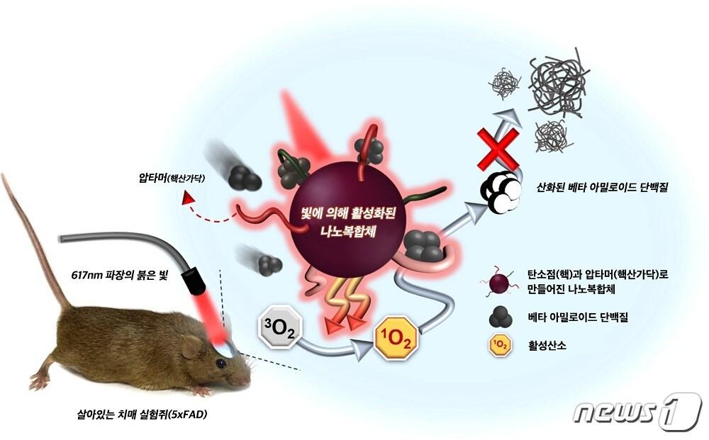 기초지원연·KAIST, 인체독성 낮은 탄소를 주성분으로 물질 합성나노복합체가 아밀로이드 플라크 형성을 억제하는 과정 (한국기초과학지원연구원 제공) ⓒ뉴스1치매 실험쥐 뇌 속 아밀로이드 플라크의 감소.빨간 점선 내 영역이 감소한 부분이다.(한국기초과학지원연구원 제공) ⓒ뉴스1관련 키워드기초지원연빛치매치료나노복합체개발