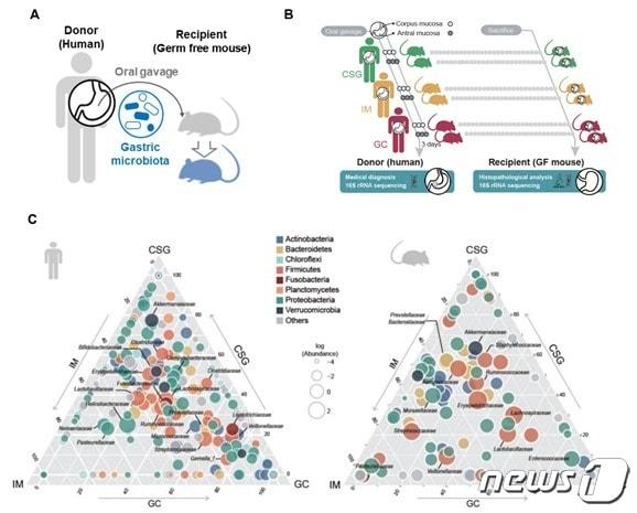 연세대 연구팀, 동물실험에서 위 질환 원인미생물 규명위강내 미생물군집 이식에 따른 장내 마이크로바이옴 분석 모식도(연세대 의대 이용찬 교수 제공) ⓒ뉴스1관련 키워드헬리코박터위암유발위속미생물연세대관련 기사'젊어서 괜찮다'는 착각…자극적 식습관이 2030 위암 부른다"한국 '위암' 고위험 국가…세계 평균보다 발병률 3배 높아"헬리코박터 제균치료, 골다공증도 예방…중장년 여성 '효과 뚜렷'