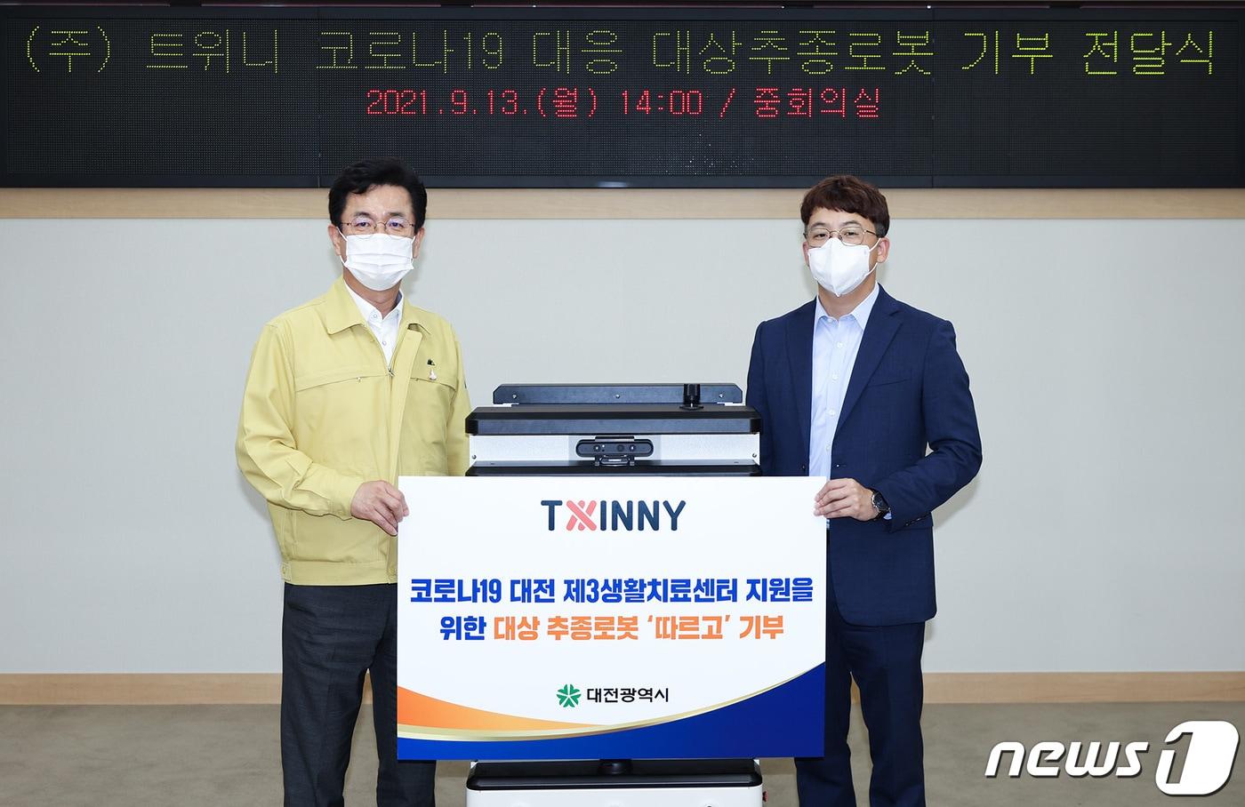 허태정 대전시장이 13일 대상 추종로봇을 기증한 천영석 ㈜트위니 공동대표와 기념촬영을 하고 있다.(대전시 제공)ⓒ 뉴스1