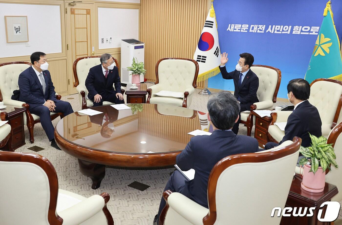 허태정 대전시장과 반장식 한국조폐공사 사장, 김장성 한국생명공학연구원장, 이광섭 한남대 총장이 16일 시청 응접실에서 상생발전 협의체 구성을 위한 간담회를 하고 있다.(대전시 제공)ⓒ 뉴스1