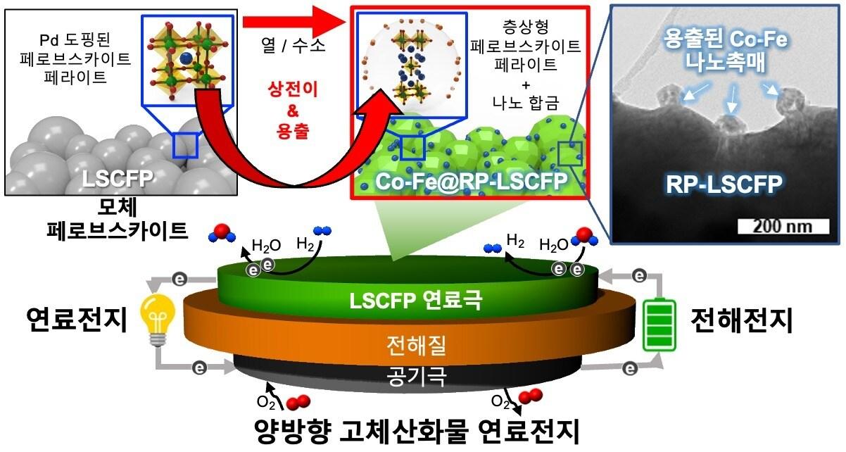 기존 대비 연료전지 1.6배·전해전지 2.4배 성능 향상Pd가 도핑된 연료극이 적용된 양방향 고체산화물 연료전지의 구동 모식도 및 고온·수소 분위기에서의 전극 표면 용출 현상에 의한 나노 합금 촉매 형성 메커니즘.(KAIST 제공) ⓒ 뉴스1관련 키워드KAIST양방향고체산화물연료전지용스마트전극개발