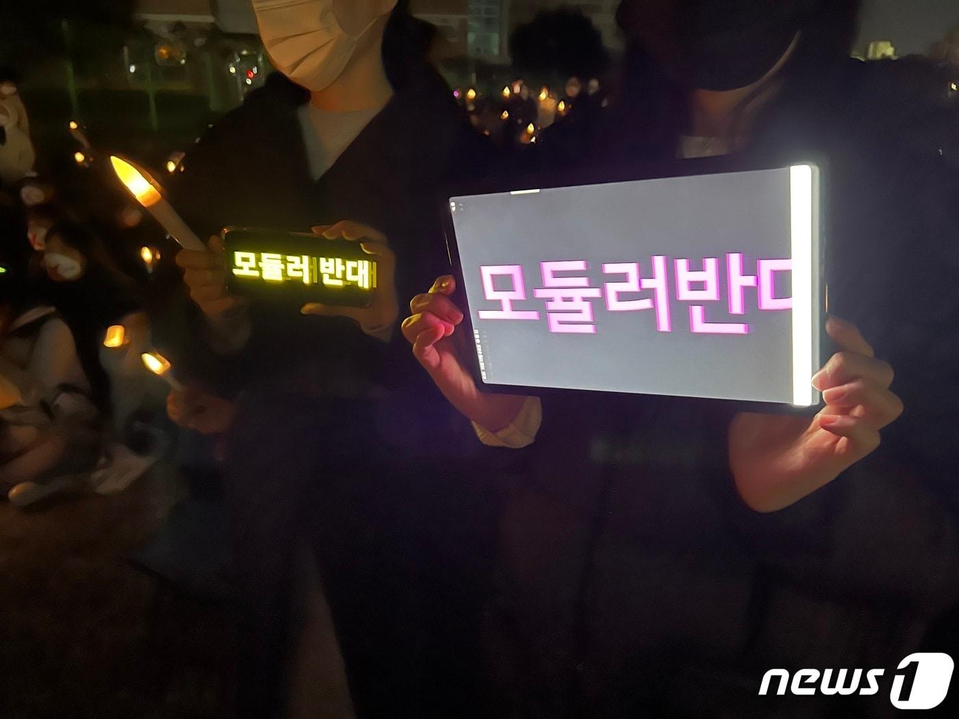 등교 거부 2주째…학부모 반발 속 ‘대안 없다’ 행정절차 돌입계약심의위 ‘협의 더 필요’ 잠정 연기…시의회 중재 시도지난 19일 대전용산초등학교 앞에서 열린 모듈러 교실 설치 반대 촛불집회에 참여한 학부모들. ⓒ뉴스1 최일 기자