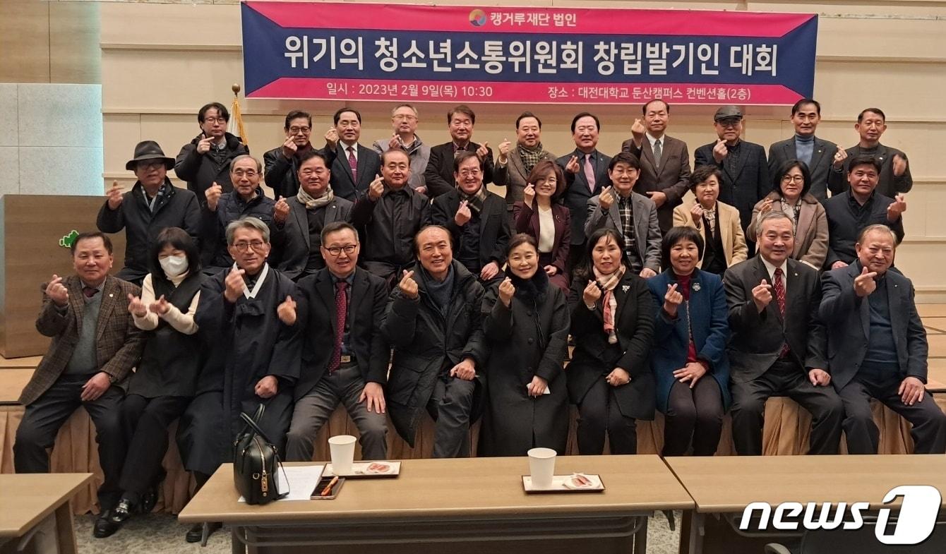 위기청소년소통위 창립…김태명 한남대 명예교수 등 50여명 참여9일 대전대 둔산캠퍼스 컨벤션홀에서 열린 ‘캥거루재단 위기의청소년소통위원회 창립발기인대회’ 참석자들이 기념촬영을 하고 있다. ⓒ뉴스1 최일 기자9일 대전대 둔산캠퍼스 컨벤션홀에서 열린 ‘캥거루재단 위기의청소년소통위원회 창립발기인대회’에서 박순선 재단 이사장(왼쪽)이 김태명 회장에게 위촉장을 수여하고 있다. ⓒ뉴스1 최일 기자