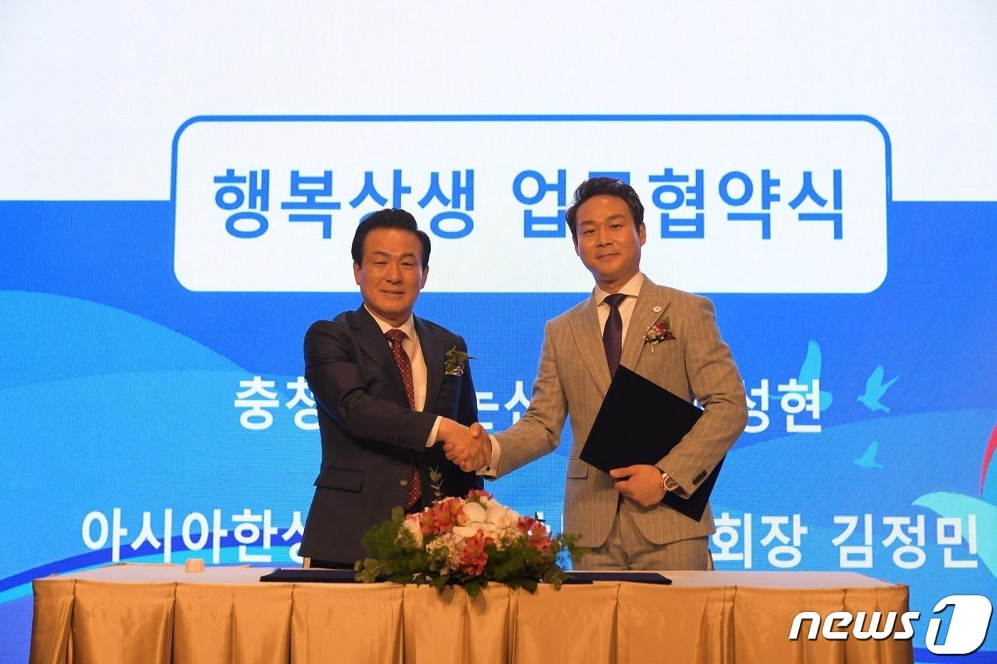 지방경제·국내 중소기업 해외 진출 활성화 지난 18일 베트남 호치민 롯데호텔에서 열린 논산시-아시아한상 베트남 남부연합회의 '행복 상생 업무협약' 체결식에서 백성현 시장과 김정민 회장이 협약 체결 후 기념촬영을 하고 있다. (논산시 제공) / 뉴스1