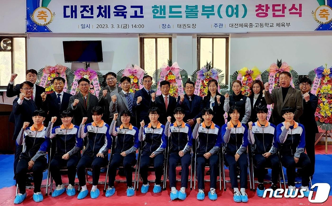 유천초-동방여중 졸업생 타지 유출 막게 돼'우생순' 주역 우선희 전 국가대표가 지도3일 대전체고 여자 핸드볼부 창단식이 열려 선수단이 기념촬영을 하고 있다. (대전시교육청 제공) /뉴스1