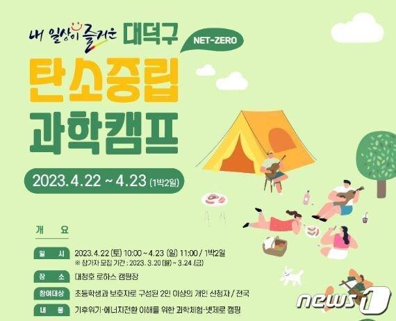 접수 첫날 62팀 몰려 3시간 만에 마감 대덕구 탄소중립 과학캠프 홍보물.(대전 대덕구 제공)/뉴스1 관련 키워드대덕구탄소중립과학캠프로하스캠핑장대청호관련 기사대전 대덕구, '대한민국환경대상' 탄소중립 분야 본상 수상