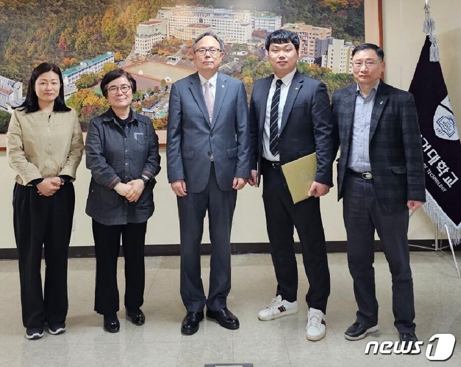 지난 12일 이병기 대전보건대 총장(왼쪽부터 세번째)과 서진무 대전 치과기공사회 회장(오른쪽부터 두번째)이 교내에서 업무협약을 맺고 기념사진을 촬영하고 있다.(대전보건대 제공)/뉴스1