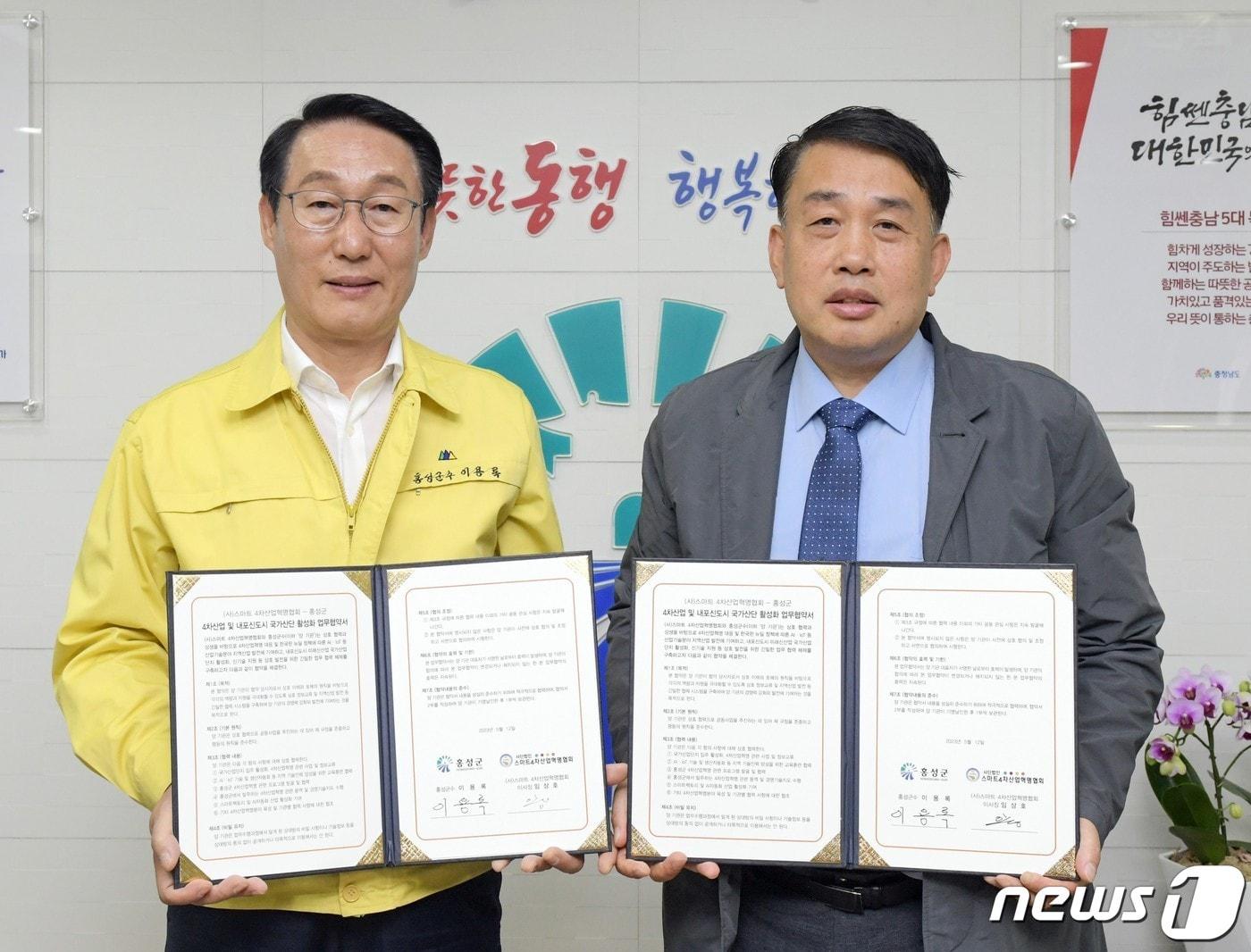 이용록 홍성군수(왼쪽)와 임상호 (사)스마트4차산업혁명협회 이사장이 12일 홍성군청에서 업무협약을 체결하고 기념촬영을 하고 있다.(홍성군 제공)