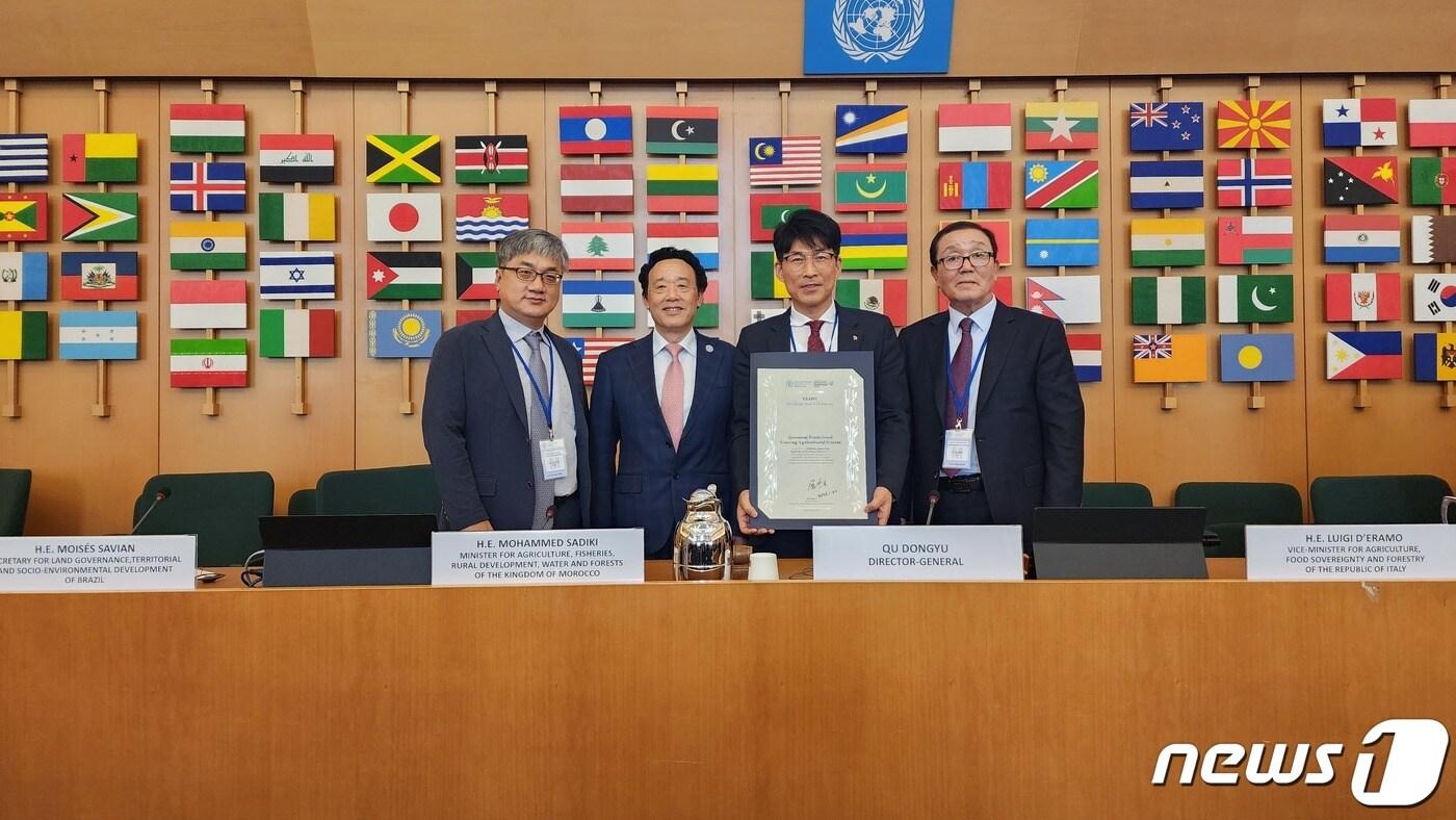 금산군이 세계중요농업유산(GIAHS) 국제포럼에서 세계중요농업유산 등재 인증서를 받은 후 기념사진을 찍고 있다. 왼쪽부터 유학열 충남연구원 박사, 취동위 국제연합식량농업기구(FAO) 사무총장, 남준수 금산군청 인삼약초과장, 이홍기 국가중요농업유산금산인삼농업주민협의회 부회장. (금산군 제공) /뉴스1
