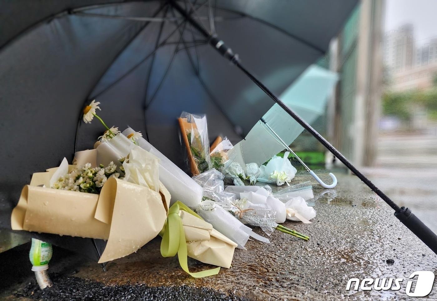 학교폭력 피해를 호소하는 글을 남기고 숨진 고 김상연군의 모교 정문에 김군을 추모하는 시민들이 남긴 국화꽃이 놓여 있다. 2023.5.28. ⓒ 뉴스1 이시우 기자
