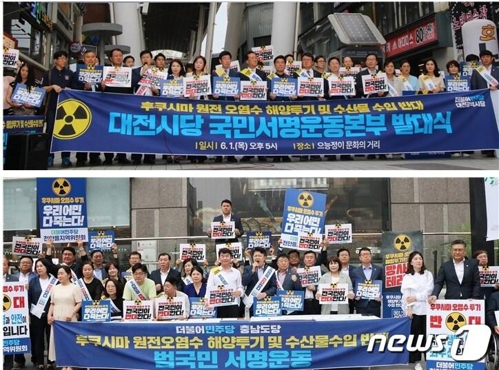 1일 더불어민주당 대전시당은 중구 으능정이 거리에서, 충남도당은 천안 신세계백화점 앞에서 각각 일본 후쿠시마 원전 오염수 해양투기 및 수산물 수입에 반대하는 국민서명운동본부 발대식을 가졌다. (민주당 대전시당·충남도당 제공) /뉴스1관련 키워드후쿠시마원전오염수관련 기사日후쿠시마원전 차수벽 설비 정지…벽 온도·기능에는 영향없어日 "센카쿠열도 접속수역서 中선박 1년간 357일 목격…역대최다"정부, 후쿠시마 오염수 방류 브리핑 중단…2년 6개월·320회 만올해 충남서 수산물 408건 안전성 조사…부적합 1건 유통 전 차단울산보건환경연 농수산물 안전관리 우수기관 선정