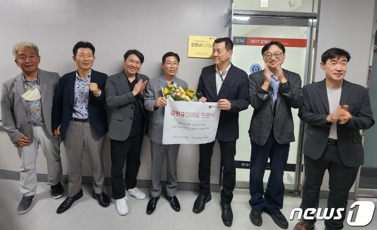강현규 ㈜에이티이엔지 대표(왼쪽 네번째)의 ‘강현규 강의실’ 명명식에서 참석자들이 축하하고 있다.2023.6.3./뉴스1ⓒ 뉴스1 이찬선 기자