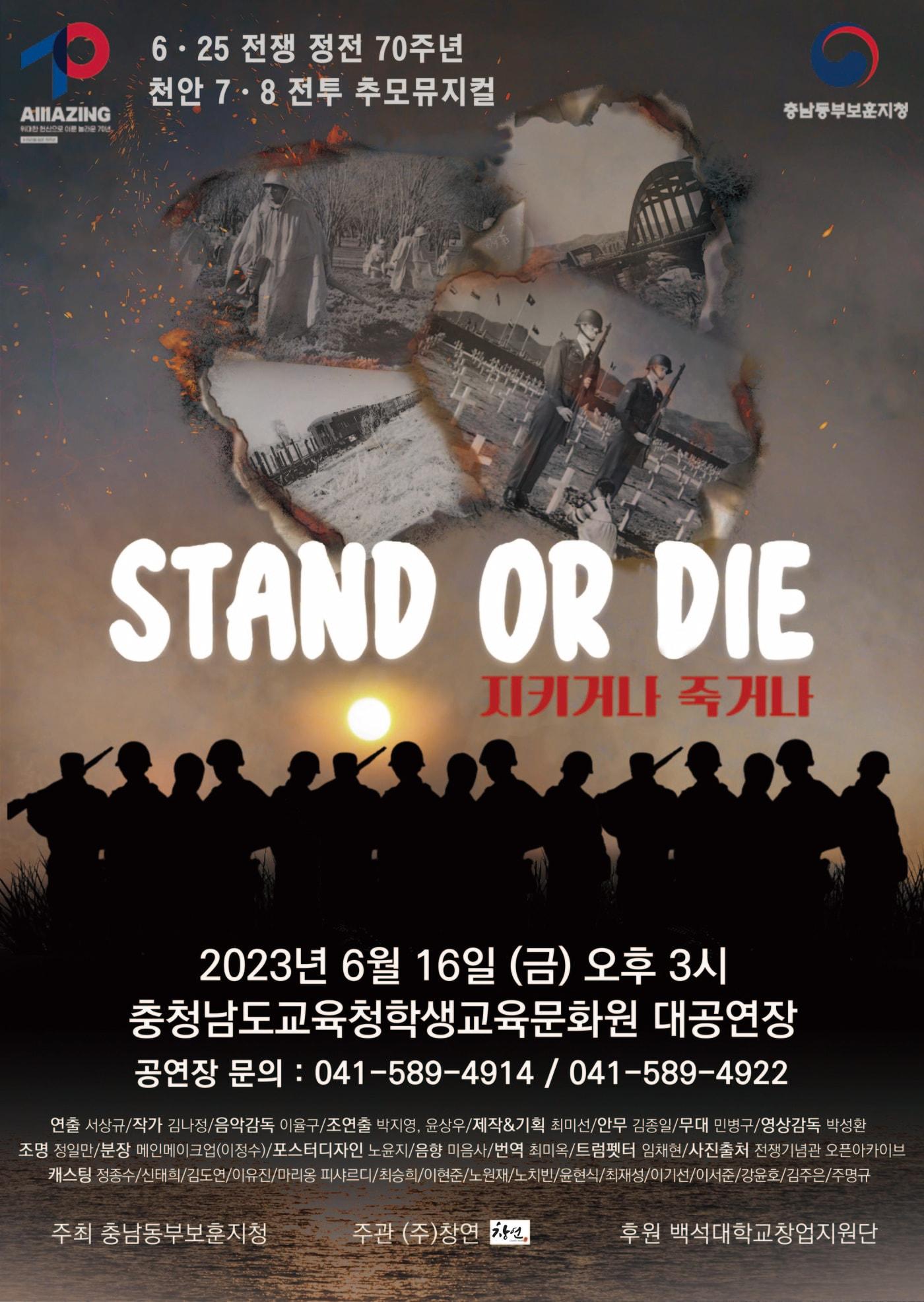 정전 70년 기념 16일 충남 학생교육문화원서 '지키거나 죽거나' 공연북한군에 맞서다 미 장병 109명 전사…백석대 학생들 기획·출연뮤지컬 '지키거나 죽거나(STAND OR DIE)' 포스터. /뉴스1관련 키워드천안 7·8전투뮤지컬이시우 기자 집행유예 중 음주운전 사망 사고 60대 징역 6년민주당 충남도당 "정부, 행정통합 인센티브 파격적"