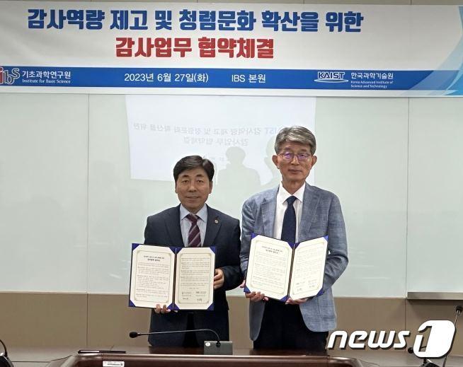 최도영 IBS 상임감사(왼쪽)와 이은우 KAIST 상임감사가 협정서 교환 후 기념촬영을 하고 있다.(IBS 제공)/뉴스1관련 키워드기초과학연구원IBS 감사한국과학기술원KAIST 감사