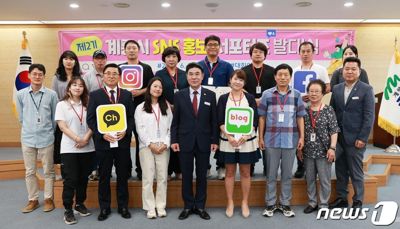 ‘제2기 계룡시 SNS 홍보 서포터즈 발대식’에서 참석자들이 단체사진을 찍고 있다. 앞줄 가운데가 이응우 시장 (계룡시 제공) /뉴스1