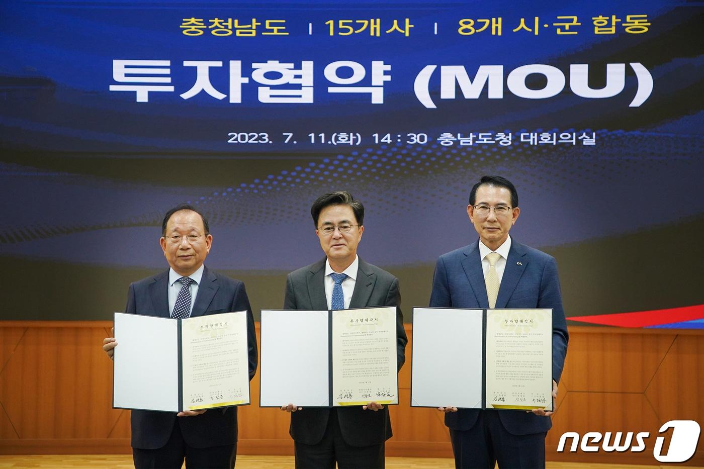 11일 충남도청 대회의실에서 열린 투자협약식 모습. 왼쪽부터 잉크테크 정광춘 대표, 김태흠 충남도지사, 이완섭 서산시장. (서산시 제공)/뉴스1
