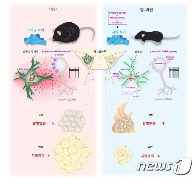 뇌 속 별세포의 지방 대사 조절 모식도.(IBS 제공)/뉴스1고지방 식이 섭취 시 GABRA5 신경세포의 활성 감소.(IBS 제공)/뉴스1KDS2010가 반응성 별세포의 지속성 가바 생성을 억제 (IBS 제공)/뉴스1이창준 IBS 인지 및 사회성 연구단 연구단장. /뉴스1관련 키워드다이어트체중감량먹으면서 다이어트기초과학연구원IBS과기정통부 출연연 연구성과관련 기사'96→41㎏' 최준희, 뼈마름 비키니 인증샷 "호캉스 수영복 장만" [N샷]'130㎏ 거구' 이대호도 '위고비' 맞았다…"20㎏ 감량, 몸무게는 비밀"박서진, 보디프로필 5개월만에 요요…백지영 "옛날 얼굴 보인다"