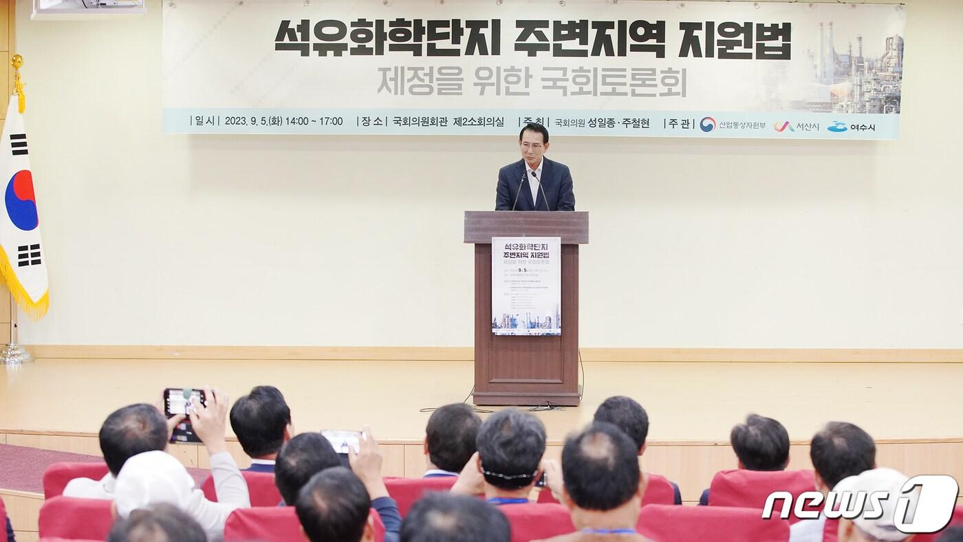 5일 서울특별시 국회의사당 의원회관에서 열린 석유화학단지 주변 지역 지원법 제정 관련 국회 토론회에서 이완섭 서산시장이 축사 모습.(서산시 제공)/뉴스1