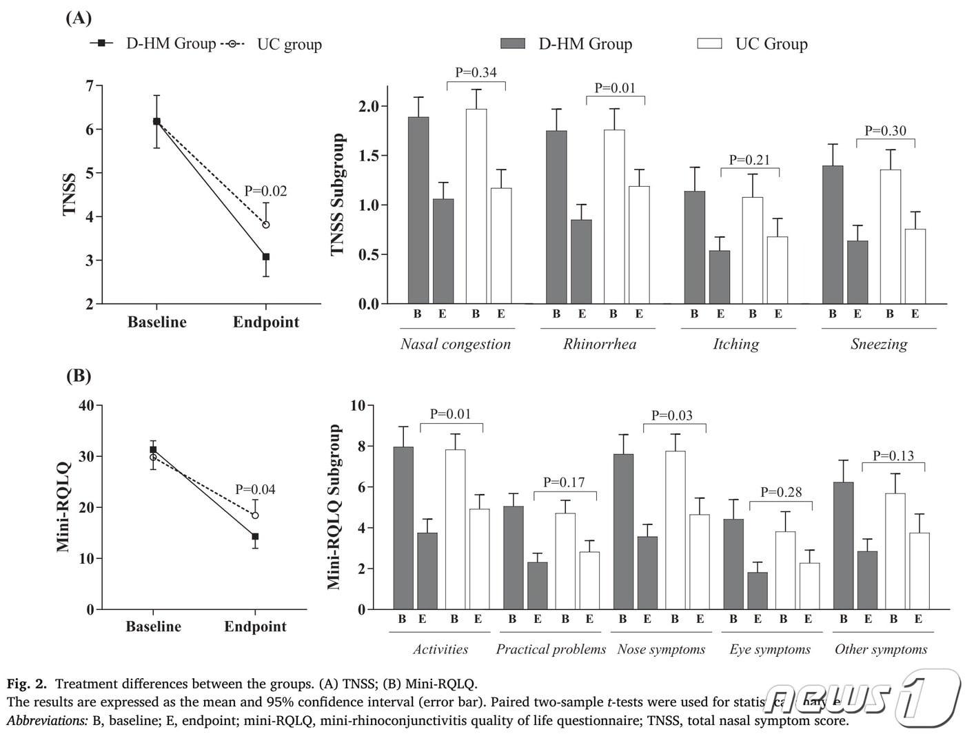 환자 증상·체질 따라 조제한 한약제형 일종첩약 복합치료군에서 일상치료군에 비해 비염 증상 및 삶의 질 지표가 통계적으로 유의미하게 감소함을 확인한 도표. (한의학연 제공)/뉴스1관련 키워드한의학연구원한의학연 손미주 박사알레르기 비염비염알레르기 치료비염 치료첩약한의학 비염 치료