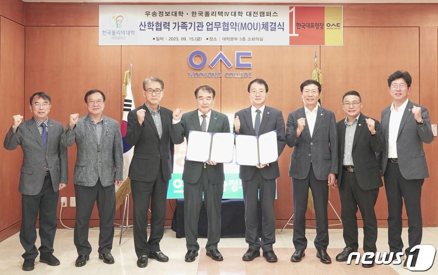 이달영 우송정보대 총장(왼쪽 네번째)과 박봉순 한국폴리텍Ⅳ대학 대전캠퍼스 학장(오른쪽 네번째)이 '산학협력 가족기관' 업무협약 체결 이후 기념사진을 촬영하고 있다.(우송정보대 제공)/뉴스1
