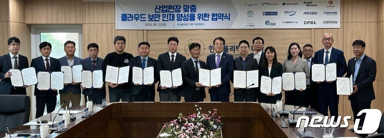 한국폴리텍IV대학 대전캠퍼스(이하 폴리텍대) 가람관에서 폴리텍대와 클라우드컴퓨팅 및 정보보안 기업 관계자들이 '인재양성 및 취업활성화를 위한 업무협약'을 맺고 기념사진을 찍고 있다.(폴리텍대 제공)